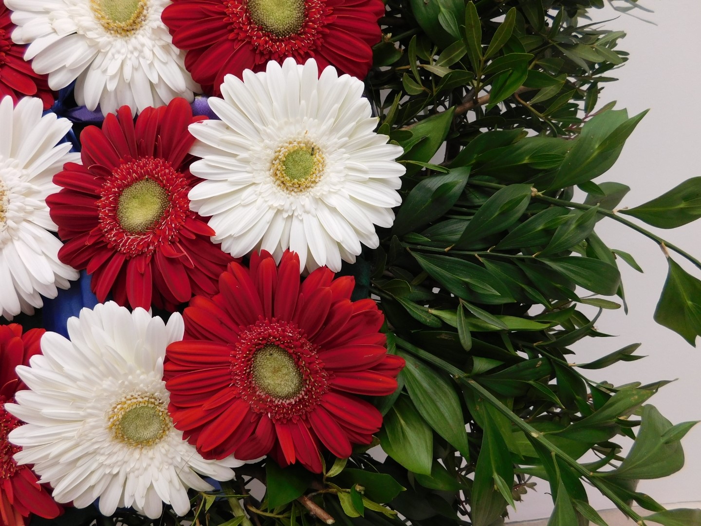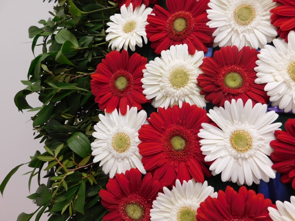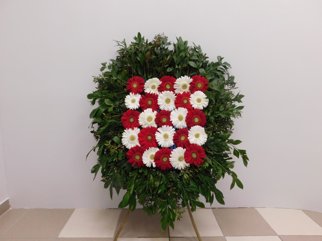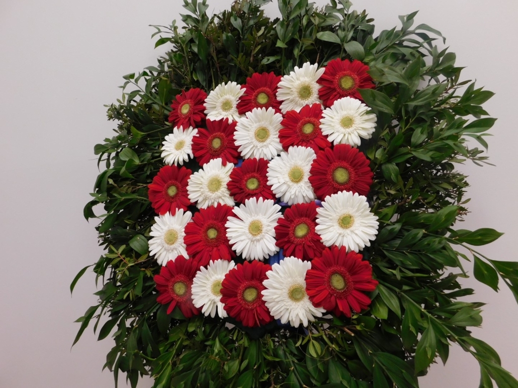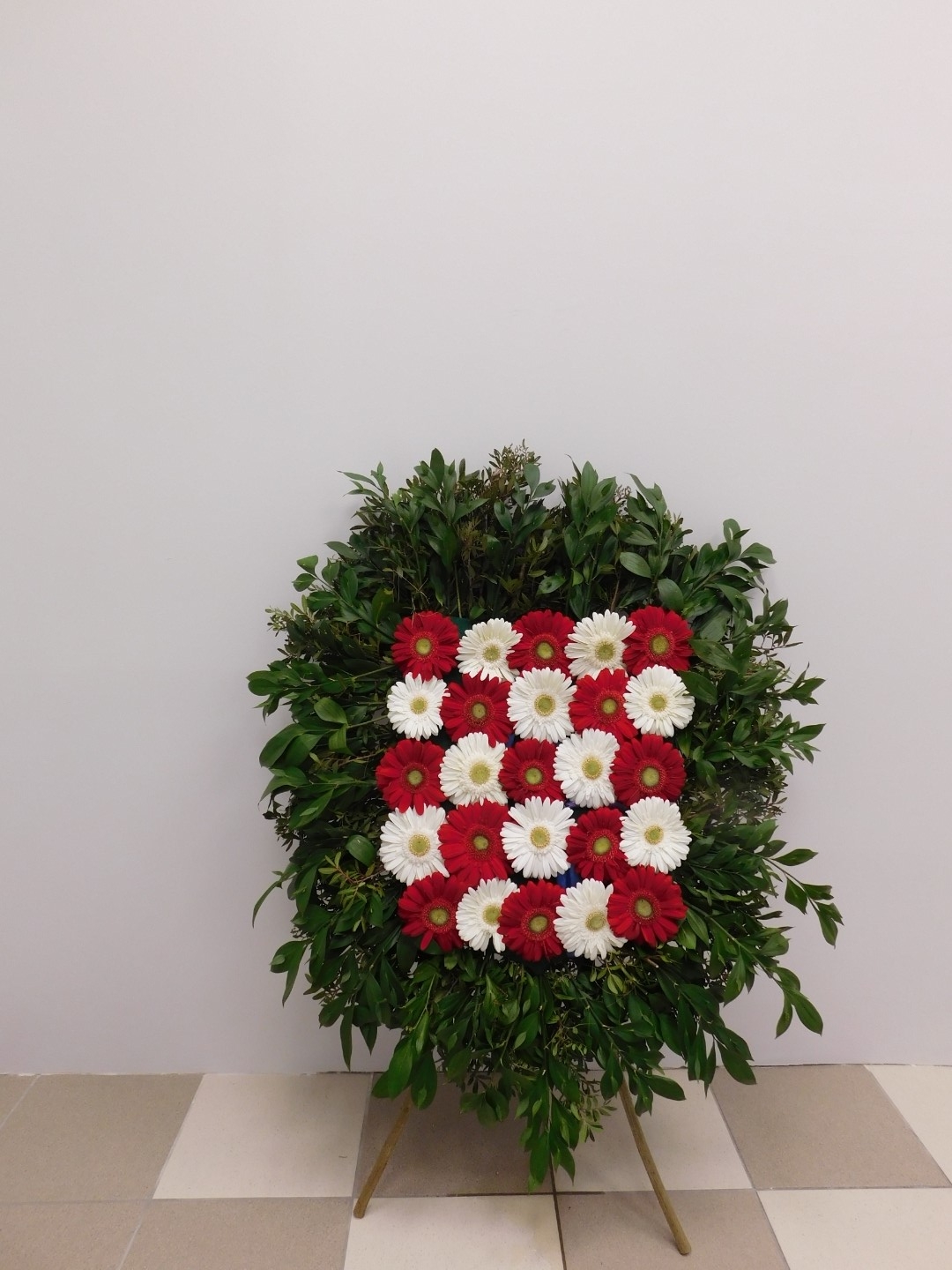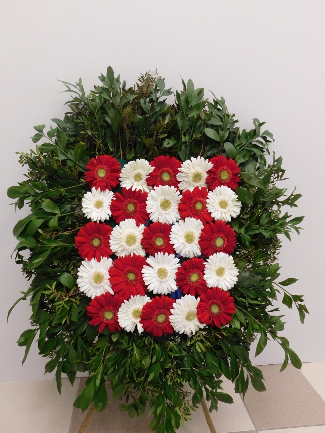 Vijenac šahovnica – zeleni okvir, crveni i bijeli gerberi